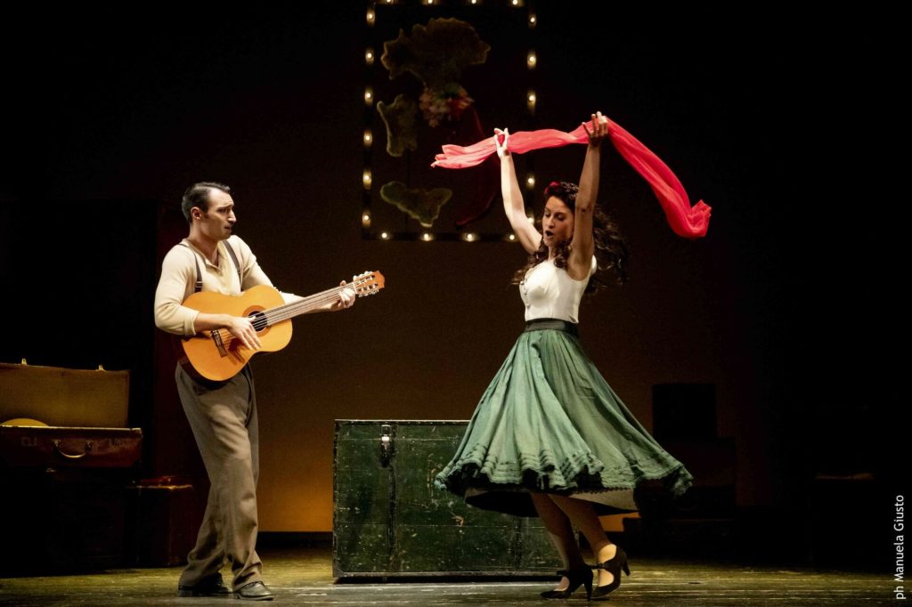 Tiziano Caputo e Agnese Fallongo, alias Tonino e Maria, protagonisti dell’irresistibile commedia, posseggono il dono di riuscire a catturare la simpatia del pubblico. Bravissimi nella recitazione (particolarmente esilarante nella parte della ricca coppia napoletana), virtuosi trasformisti e perfetti nelle varie cadenze dialettali che riguardano le diverse inflessioni di tutte le regioni d’Italia. Dotati entrambi di voci che possono essere modulate e permettere di raggiungere varie tonalità che vanno dagli acuti (particolarmente eccellenti quelli di Fallongo) agli effetti più bassi, i due, estremamente affiatati, veri animali da palcoscenico, raggiungono ottimi risultati nell’affrontare i generi più disparati dove la resa è ancora più evidente dal fatto che i brani, tutti popolari riarrangiati, sono eseguiti dal vivo, come lo sono gli accompagnamenti musicali della chitarra di Caputo. L’attenta regia di Raffaele Latagliata con il coordinamento creativo di Adriano Evangelisti si distinguono nell’abile inserimento degli interventi canori che conferiscono dinamismo a tutta la messa in scena (lo spettacolo più che un musical è una commedia con musiche, scelte accuratamente in funzione della vicenda e riflettono il periodo narrato). Degna di nota la scenografia, dovuta a Andrea Coppi, costituita da elementi tipici della gente di teatro, come un paravento per i cambi d’abito e un baule, oltre a valigie, proprie di persone in continuo movimento, simbolo di quel senso di provvisorietà che è quello affrontato dai due artisti alla ricerca della fama. Degni di citazione sono infine Giorgia Marras per i costumi e Annarita Gullaci per i movimenti coreografici.