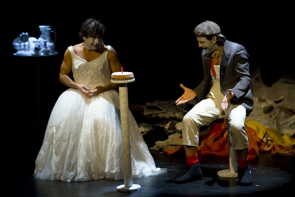 Poi qualcosa cambia. I due si spostano dalla postazione e arretrano verso il fondo della sala nel punto in cui il parterre è sommerso da una coltre di stracci di vari colori tra i quali entrambi vanno a frugare in modo nervoso e con gesti ripetitivi. Cercano due cucchiaini, ne trovano uno, poi, con più fatica, un altro. La donna prende dei fogli di giornali e ne forma una bambola quindi indossa una parrucca diversa e entra in un altro personaggio. In quel momento si diffonde nuovamente la cantilena della bambina: “La mia mammina è incinta. le mie sorelle sono gemelle. Io sono Lola e sono spagnola. Vado a scuola per imparare l’italiano”. È a questo punto che si definiscono meglio i ruoli dei due: lei è un bambino che ama vestirsi da donna, e ha addosso l’abito che forse la mamma morta aveva indossato per il matrimonio. Lui è il padre e i rimproveri e l’asprezza usati nel parlare di prima erano giustificati dal fatto che non voleva che il figlio indossasse abiti femminili. È un’ipotesi, ma forse troppo lineare perché ora i due si scambiano i ruoli. Lui indossa gli abiti femminili e lei quelli maschili. Lo scambio di genere rimette tutto in discussione. E tuttio riparte di nuovo.