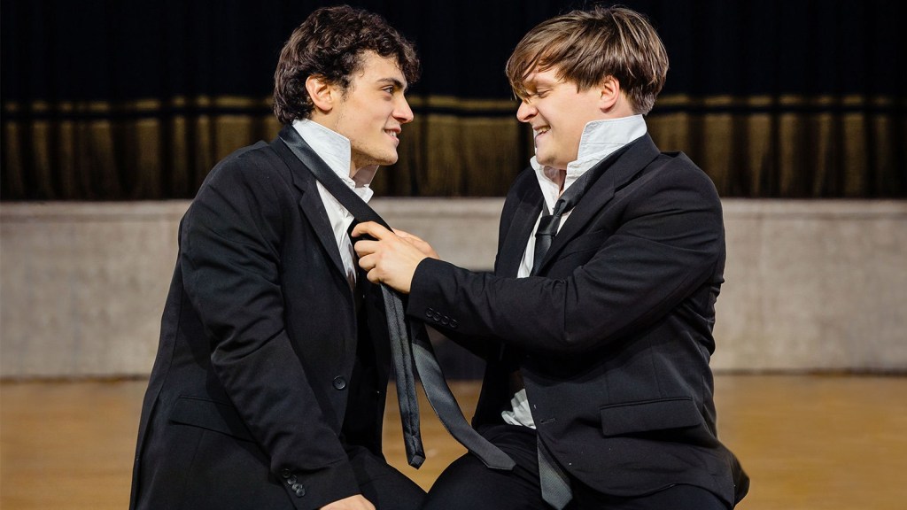 L’allestimento di Leonardo Lidi è di forte realismo e non ci sono censure né nella lingua, che è quella comune della generazione rappresentata, né nella performance fisica dove i due attori, nell’ars amandi e tanto per citare un bravo critico amico, “ci danno dentro con passione”. In effetti Alessandro Bandini e Alfonso De Vreese si dimostrano veri fuoriclasse nel sapersi calare alla perfezione nella psicologia dei loro personaggi e non solo nel linguaggio verbale, ricco di ampie sfumature che vanno dall’urlato al sommesso, dall’incalzante al mesto, ma anche nell’eccellente e non comune gestione dei corpi che si manifesta nella simulata partita a padel e nelle continue, veloci corse dal parterre ai punti più alti della sala raggiunti attraverso gradinate non sempre agevoli.